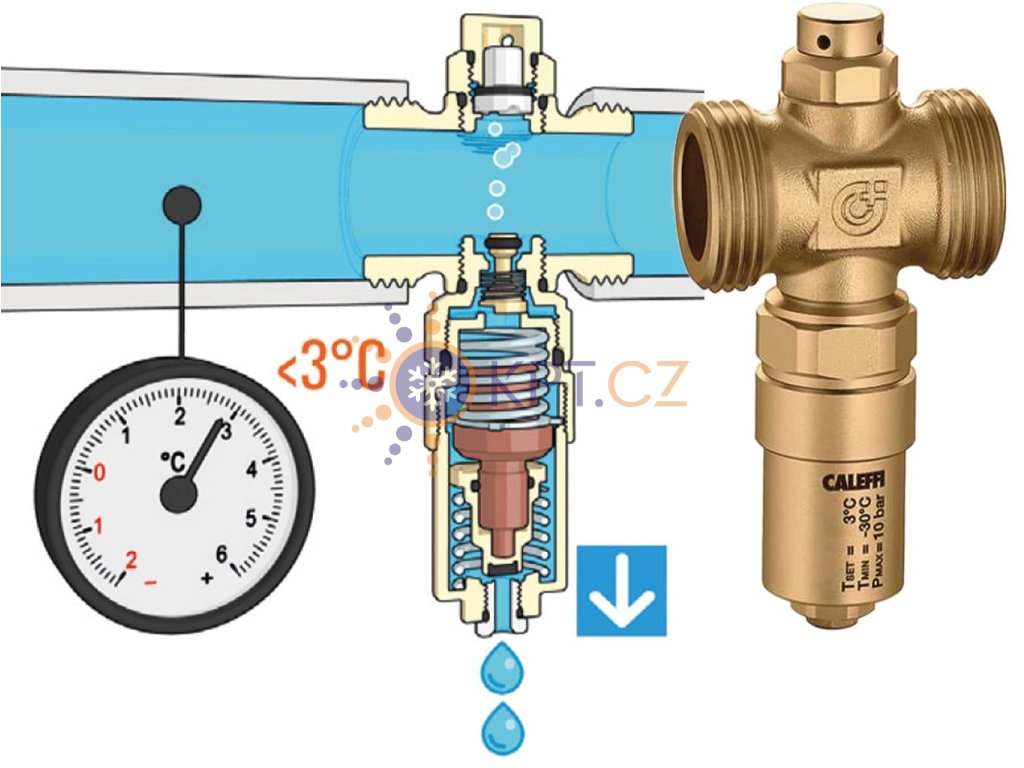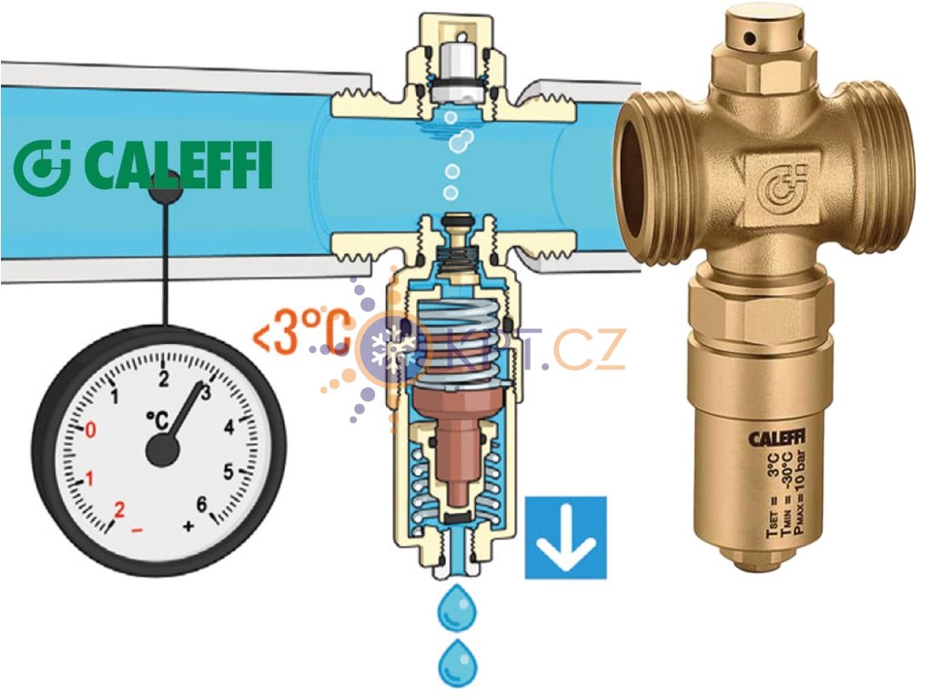 ✅ Chytré “kapání” místo trvalého odtoku – ventil není vypouštěcí ventil; při 3 °C jen krátce odlehčí okruh a po ohřátí vody nad 4 °C uzavře. Caleffi S.p.a.