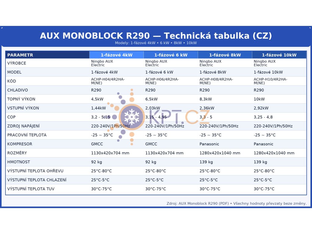 Konkrétní technické údaje se mohou lišit podle sériové varianty a nastavení systému. Pro finální specifikaci doporučujeme nahlédnout do aktuálního technického listu AUX pro model 12 kW (3F) R290. Vlastnosti řady (A+++, SCOP až 5,4, 80 °C, Silent režim, –25 °C, paralelní zapojení) jsou doloženy oficiálními materiály výrobce.