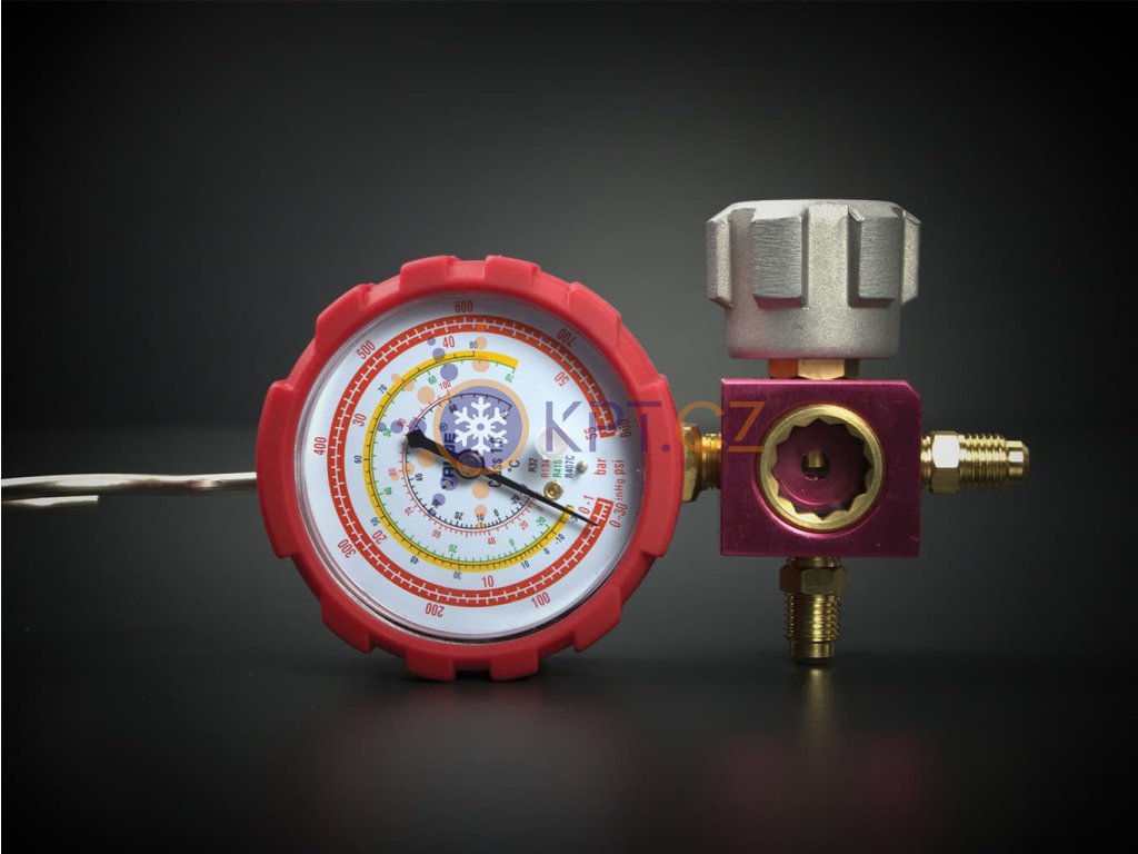 Jednoduchý nízkotlaký manometr určen pro chladicí a klimatizační systémy.