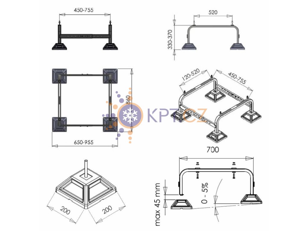 Víceúrovňová možnost nastavení základny umožňuje přizpůsobení nerovnostem podkladu, což zajišťuje, že vaše zařízení bude vždy stabilně a rovně umístěno. Ocelový rám je navíc chráněn proti korozi díky pozinkování a práškovému nástřiku, což znamená, že si základna zachová svůj estetický vzhled po dlouhou dobu.